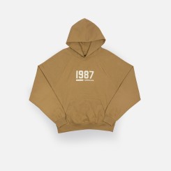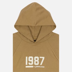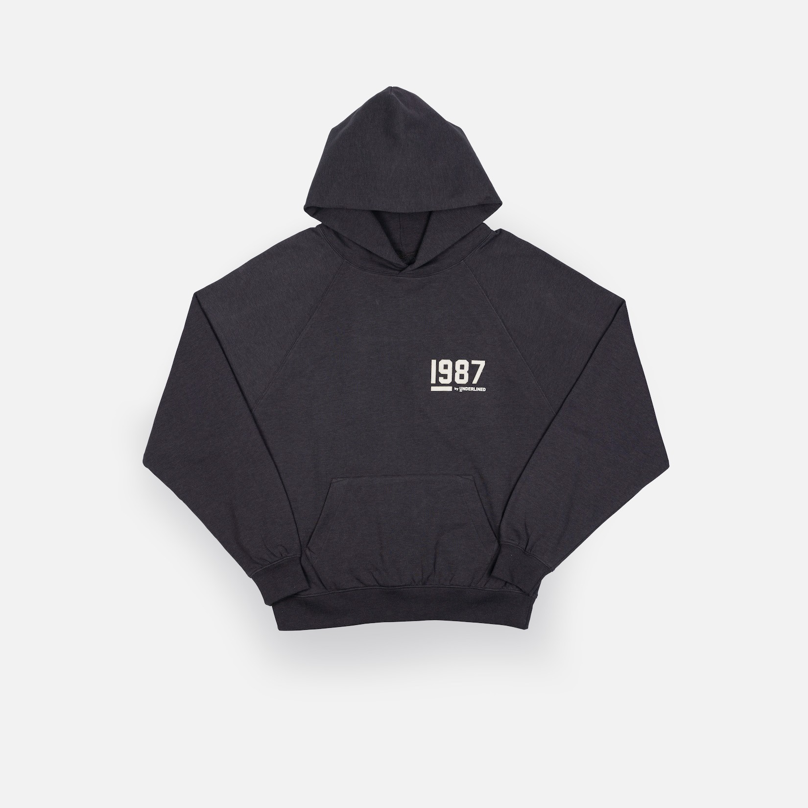 Classic fleece hoodie features rib neck, rib banded hem and cuffs. Raglan shoulder enhances the comfortable fit.  1987 by Underlined soft touch felt logo.