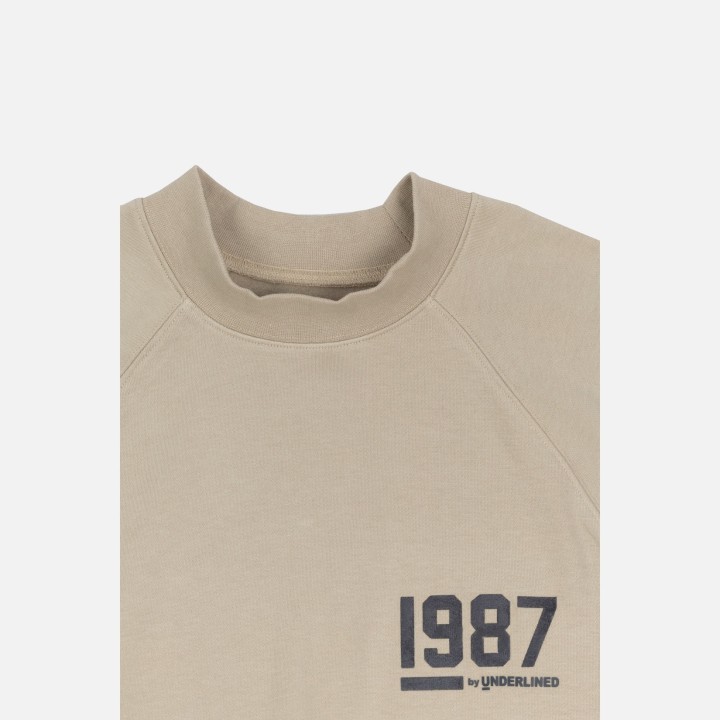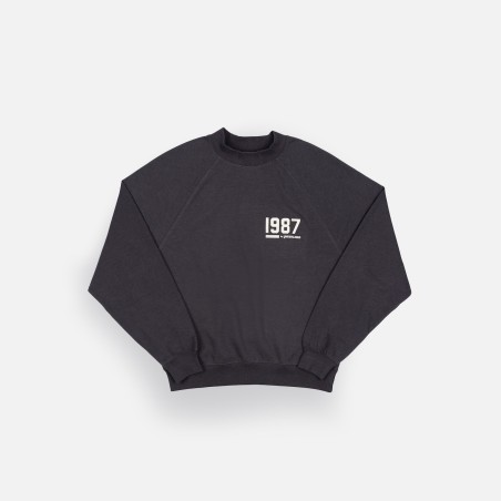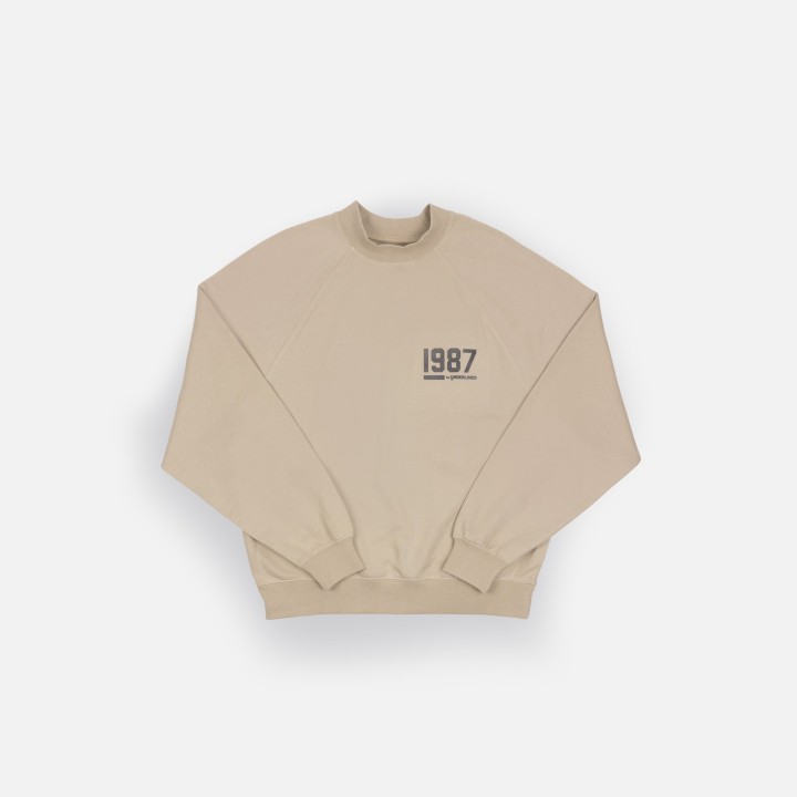 Classic fleece sweatshirt features rib neck, rib banded hem and cuffs. Raglan shoulder enhances the comfortable fit.  1987 by Underlined soft touch felt logo.