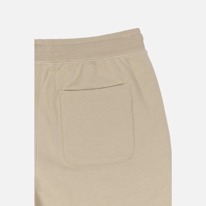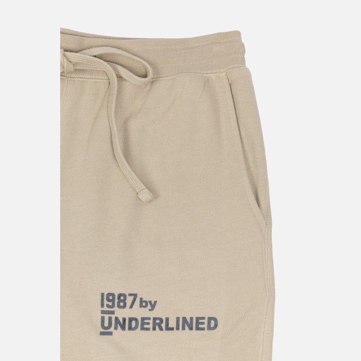 Encased elastic waistband with elongated draw cord, front hand pockets and one back pocket. 1987 by Underlined soft touch felt logo.