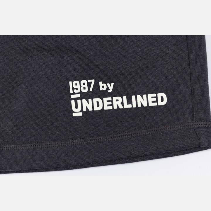 Encased elastic waistband with elongated draw cord, front hand pockets and one back pocket.  1987 by Underlined high density printed logo.