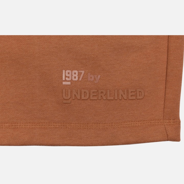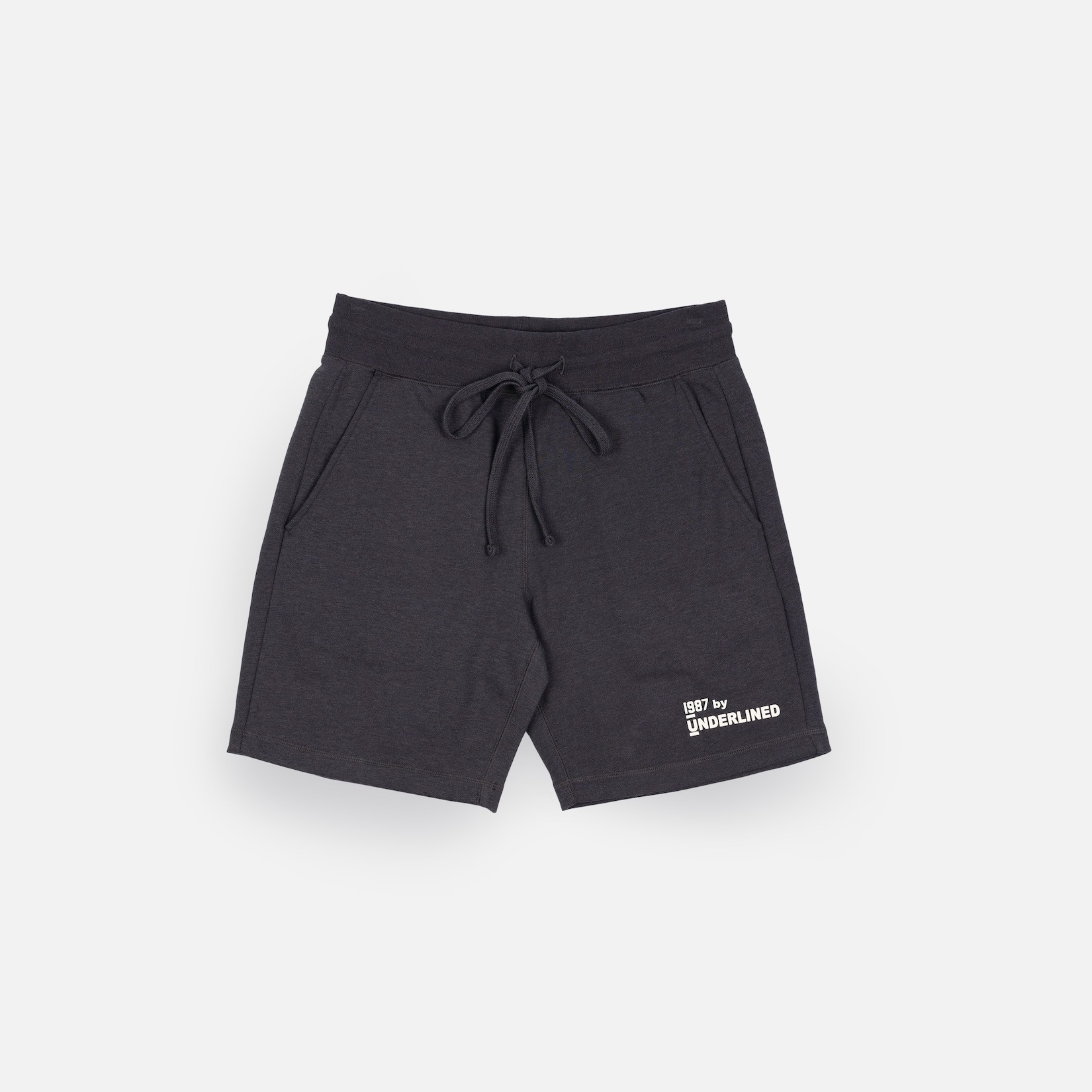 Encased elastic waistband with elongated draw cord, front hand pockets and one back pocket.  1987 by Underlined high density printed logo.